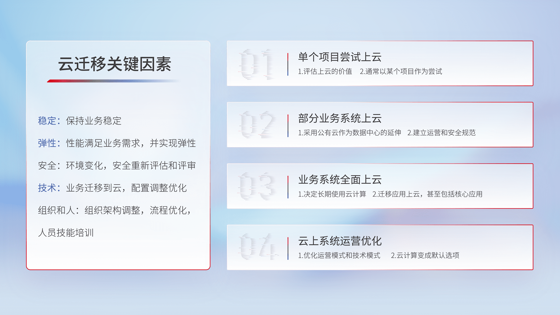 结合实际业务,,从规划设计、、云平台选型、、云原生改造、、、、数据迁移、、、、集成交付,,,迁移全过程为客户识别最佳上云路径,,做好风险识别管理,,设计网络架构、、、、身份权限、、安全审计合规、、、操作审计、、日志审计、、、、监控告警策略、、多站点容灾设计等,,,,对云上基础设施进行整体规划,,,,提升IT治理水平,,以满足弹性、、、高可用、、高性能的需求。。。